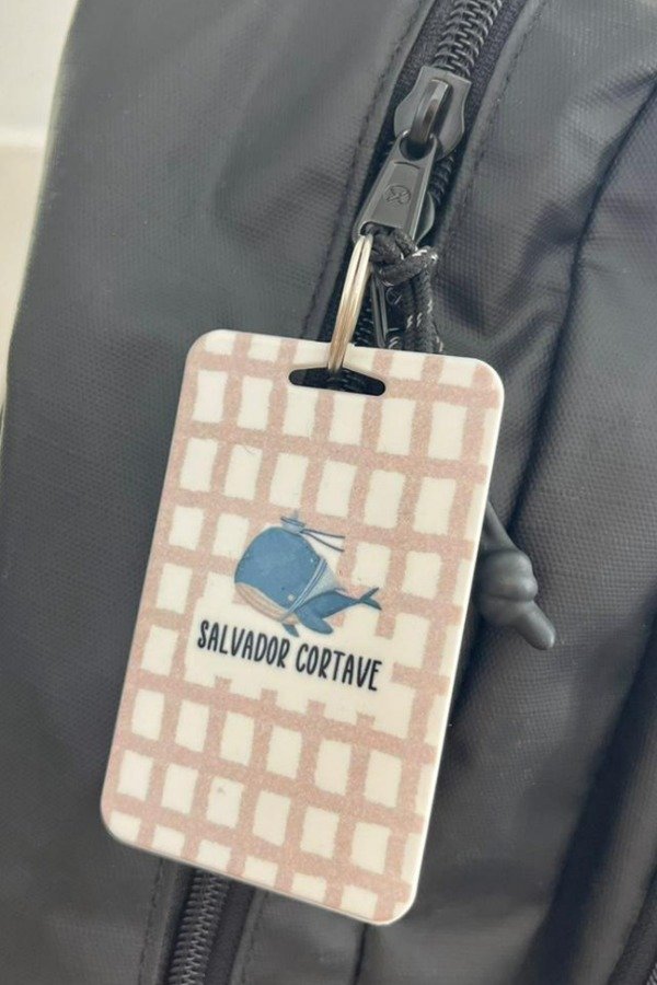 Identificador sublimado de plástico. Podés estamparlo como te cope y mide 3,8cm x 5,3cm.